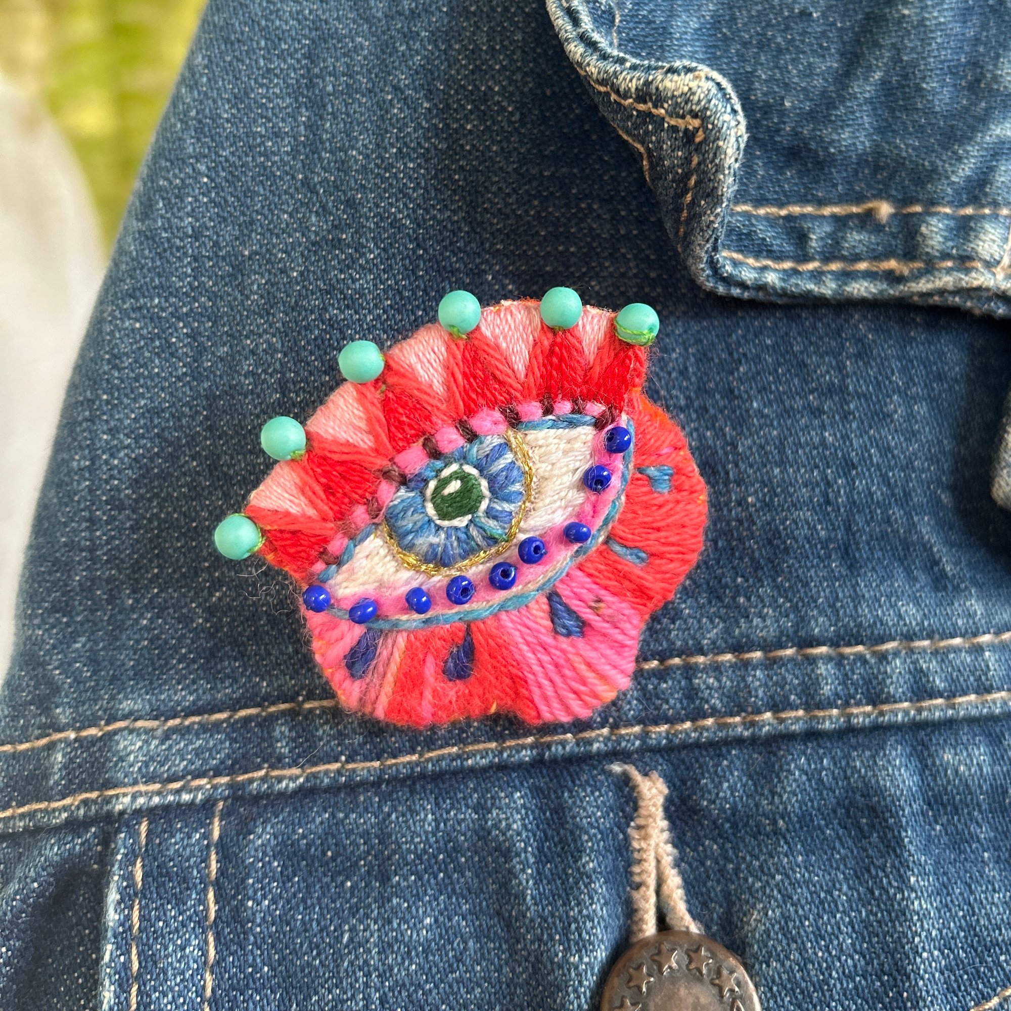 A gorgeous bright and colourful brooch hand stitched in yarn and cotton threads with seed beads. This brooch is a unique piece of wearable art to be worn and cherished.