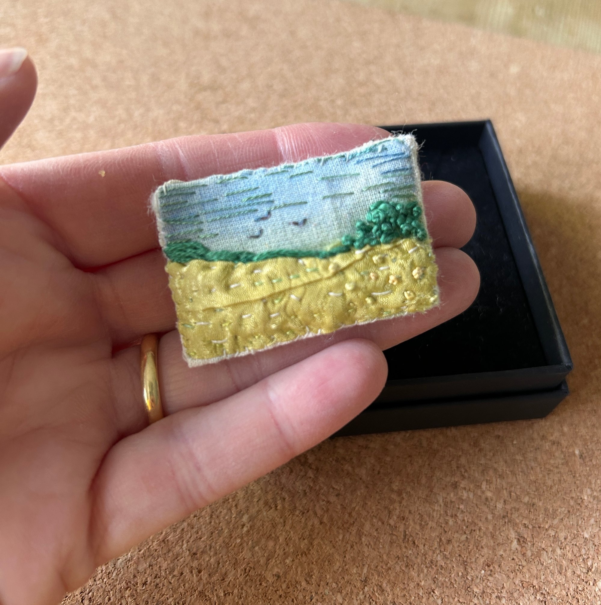 I dream of landscapes, a beautiful little brooch hand embroidered with added silk recycled fabric and paint. Lightly padded with a quality brooch bar on reverse.